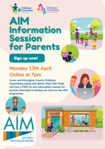 Cavan and Monaghan County Childcare Committees, together with the Better Start AIM Team, are hosting a FREE online information session for parents to learn more about the AIM programme.