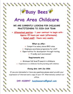 If interested you can drop your CV to the Busy Bees premises, you can ring 049 432 8947