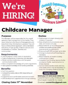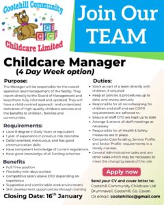 Cootehill Community Childcare Service have a vacancy for a Childcare Manager.